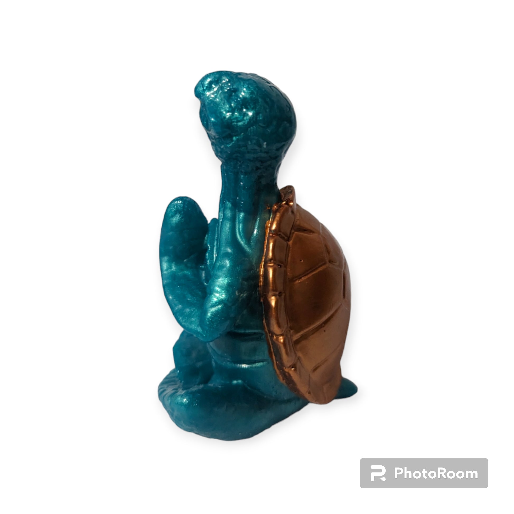 "Find inner peace with this adorable Meditating Sea Turtle statue. Hand painted in metallic copper, this 4in tall and 2.5in wide statue will bring a calming presence to any space. Perfect for turtle lovers and meditation enthusiasts alike."
